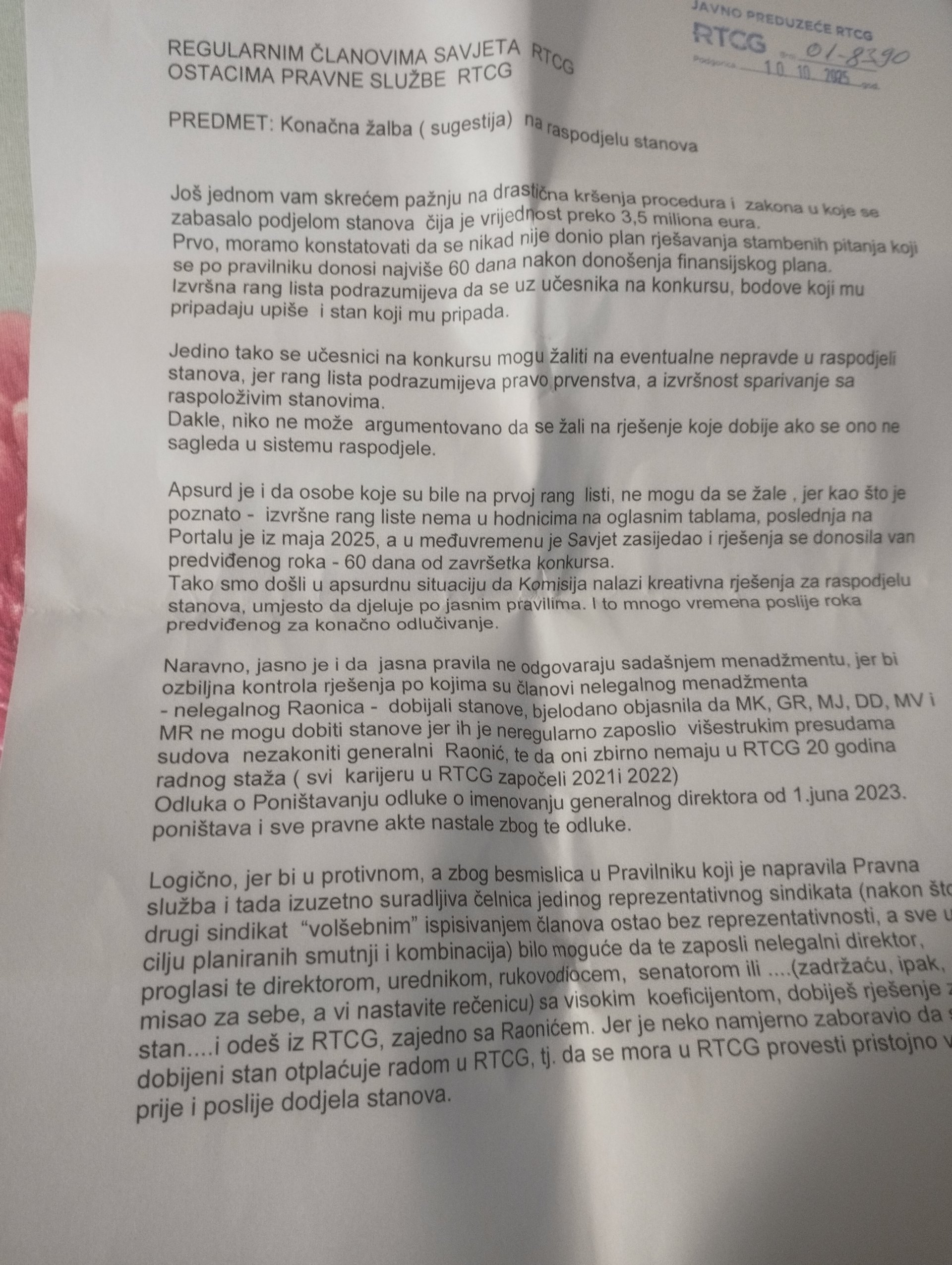 U pismu, koje je Čović uputio i, kako navodi, „ostacima pravne službe RTCG“, navodi se da raspodjelu stanova, čija je ukupna vrijednost oko 3,5 miliona eura, sprovode „nelegalni generalni direktor i uslovno osuđeni članovi Savjeta“.