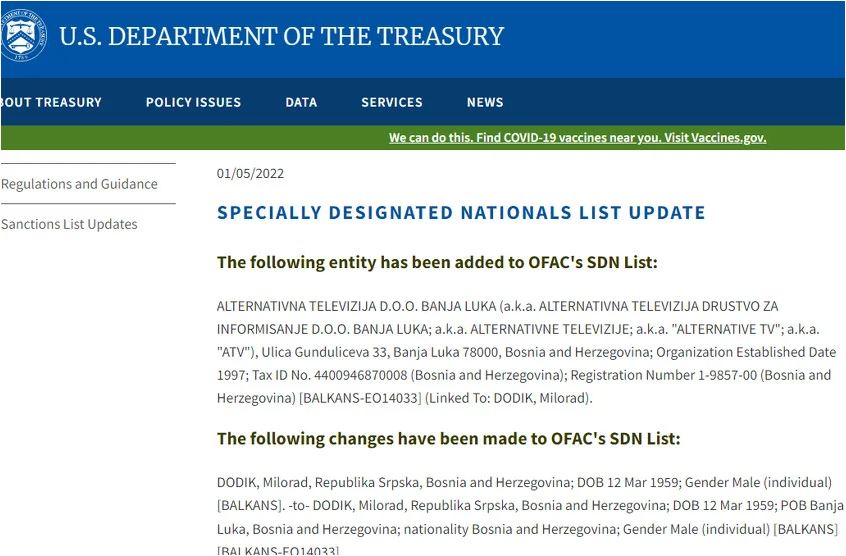 Nakon što je Ministarstvo finansija SAD-a u decembru objavilo proširenu listu sankcionisanih osoba i kompanija iz Srbije, Hrvatske, Kosova i Bugarske, a koje se povezuju s korupcijom i drugim nezakonitim aktivnostima, "crna lista" je sada proširena i na firme i pojedince iz Bosne i Hercegovine.