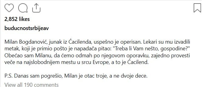 „Junak iz Ćacilenda, uspješno je operisan. Ljekari su mu izvadili metak, koji je primio pošto je napadača pitao: ‘Treba li Vam nešto, gospodine?’ Obećao sam Milanu, da ćemo odmah po njegovom oporavku, zajedno provesti veče na najslobodnijem mjestu u srcu Evrope, a to je Ćacilend“, napisao je Vučić.
